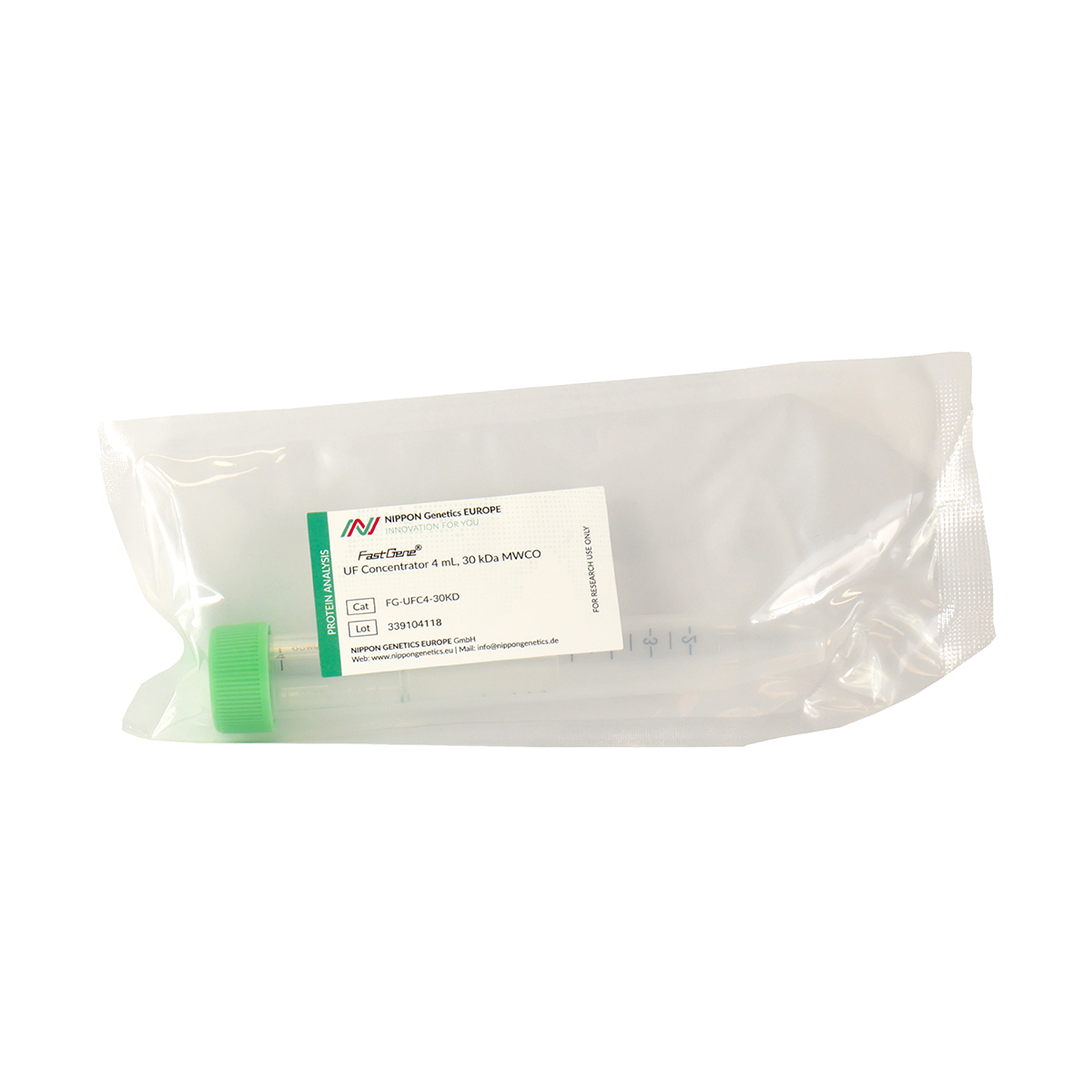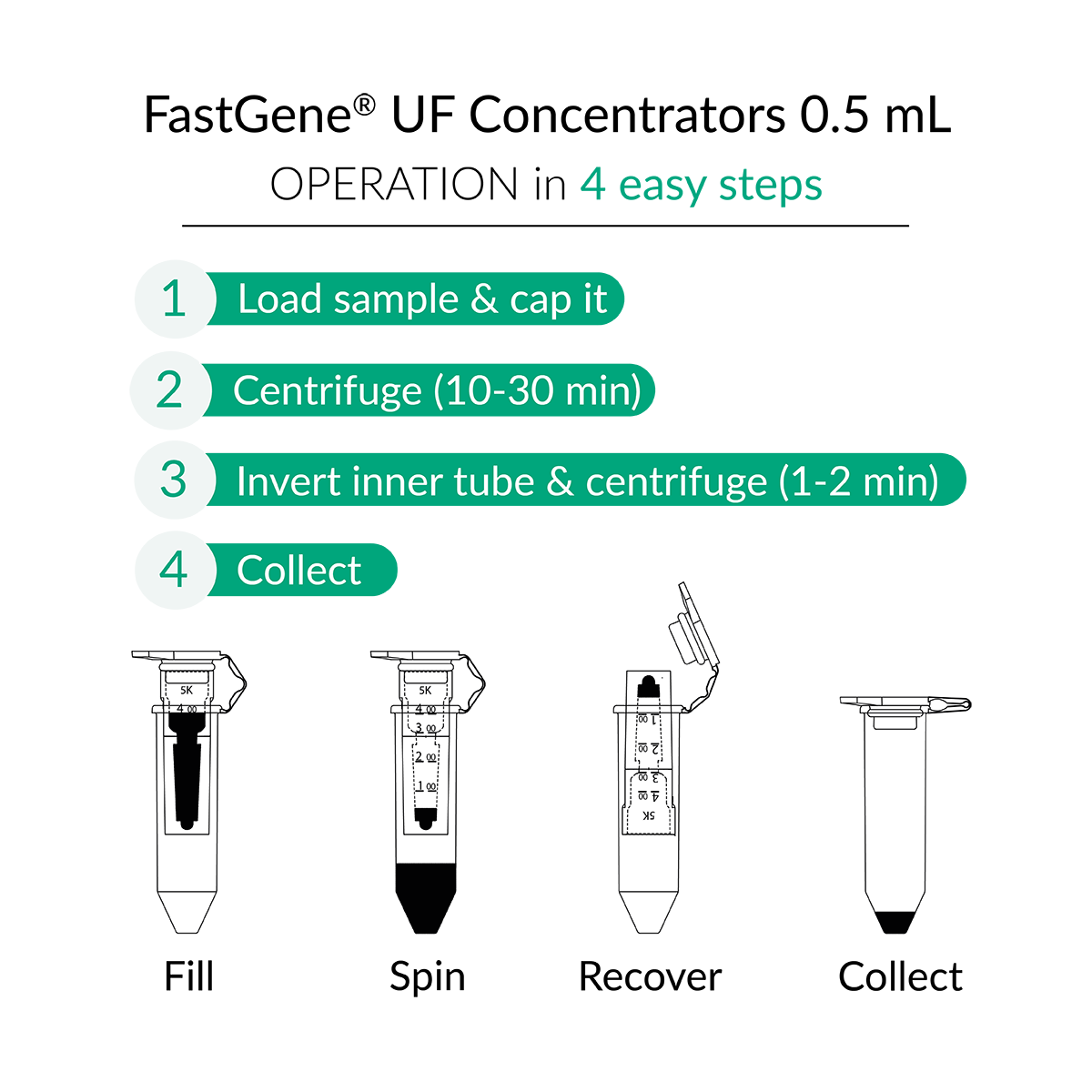 All FastGene® UF Concentrators are single-use, non-sterile devices. Reuse may reduce performance and risk contamination. Reuse is not recommended.