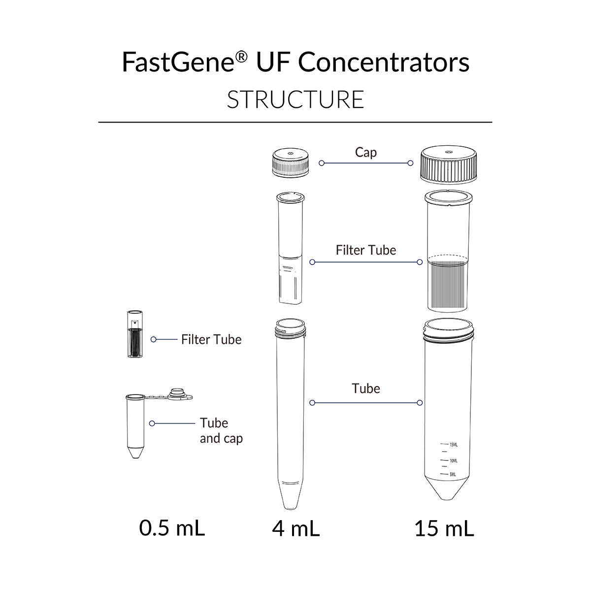 FastGene® UF Concentrators are offered in three sizes – 0.5 mL, 4 mL, and 15 mL – each in three molecular weight cut-offs (MWCO): 10 kDa, 30 kDa, and 100 kDa.